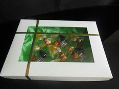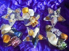 The resin Christmas decorations are made in tree or snowflake molds. Laura collects all the shells from Firemore Beach and the heather from the hills surrounding her Highland home, or uses bright Christmas glitter and arranges the chosen items into the desired design and then casts them into resin through a complex process. The pieces are then finished by being hand-sanded, hung and displayed in a window box in sets of six. A selection can be seen below.